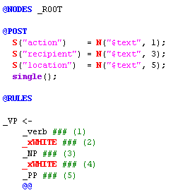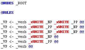 The rules below are not in standard rule format. Notice that the elements (_VP, _verb, _xWHITE, etc.) in each rule are all on the same line.